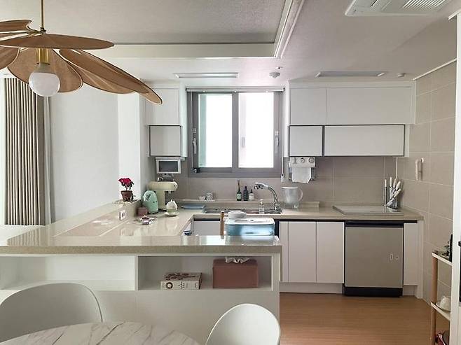 거실과 주방이 붙어있어 공간 구별이 안되거나 오픈된 주방이 지저분해 보일까 봐 걱정했는데요. 다행히 아일랜드 조리대가 높게 올라와 있어 거실에서 주방 안쪽이 잘 안 보여요.
