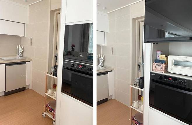 이사 오기 전에는 오븐, 전자레인지를 모두 따로 썼는데, 빌트인 전기 레인지를 사용하니 소형가전 개수도 줄어들고, 벽 공간을 활용할 수 있어 좋아요.