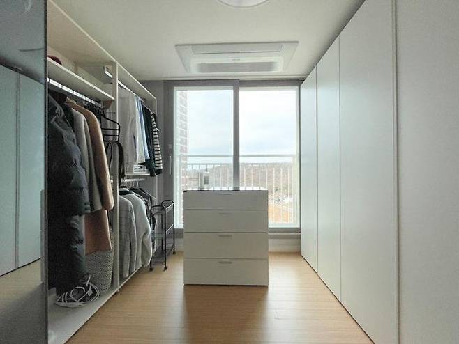 깔끔한 남편이 관리하는 옷방은 들어갈 때마다 쾌적하다 느끼고 있어요. 다른 계절의 옷들과 침구는 붙박이장 안에 넣어 보관하고, 계절에 맞는 옷만 밖에 걸어놓아요.