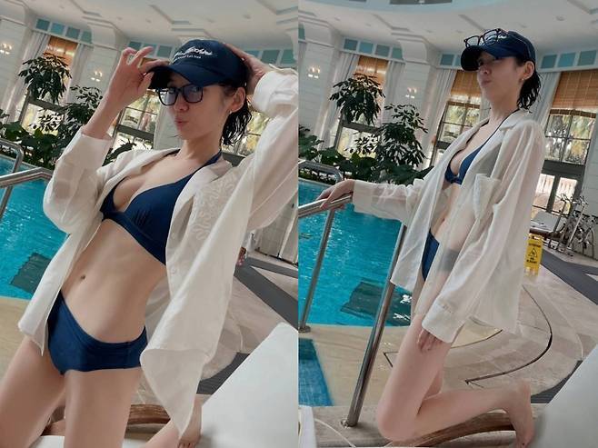 박지현은 청량한 네이비 비키니에 시스루한 화이트 셔츠를 가볍게 걸쳐 내추럴한 분위기를 자아냈습니다.