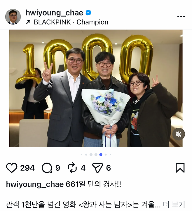 최휘영 문화체육관광부 장관도 7일 SNS를 통해 장항준 감독과 만난 사진을 공개했다. 최 장관은 ‘왕과 사는 남자’를 두고 “얼어붙어 있던 한국 영화계에 따뜻한 희망이자 축복 같은 작품”이라고 적었다.