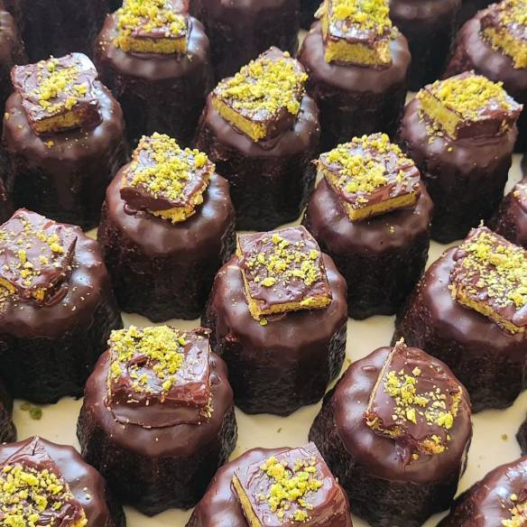 원래도 바삭한 까눌레에 두바이 초콜릿이 더해져 바삭함이 배가 되었습니다. 서울 서초구의 〈디끌레〉에서 판매 중인 '두바이 초콜릿 까눌레' 이야기인데요. 식감은 물론 고소한 맛도 일품이라는 평이 이어지고 있어요. 까눌레에 이어, 다쿠아즈 버전의 두바이 초콜릿을 맛볼 수 있는 것도 주목할 점! 인증샷을 부르는 먹음직스러운 비주얼이 시선을 사로잡네요. 참, 디저트 맛집인 이곳에서 두바이 초콜릿 디저트만 맛보기엔 아쉬울 지도 몰라요. 피스타치오 러버를 위한 메뉴도 다양하게 준비돼 있거든요. 체리피스타치오 타르트를 시작으로 피스타치오 에끌레어와 까눌레까지! 보기만 해도 눈이 즐거운 디저트가 가득하네요.