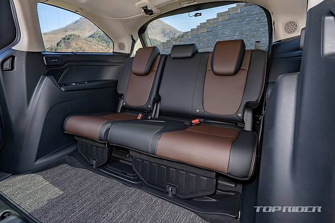 시트 구성이 독특한데, 2+3+3의 8인승과 2+2+3의 7인승을 함께 지원한다. 2열 가운데 시트를 탈착해 트렁크 하단에 보관할 수 있다. 4인 혹은 3인으로 구성된 두 가족이 함께 여행할 경우 유용하다. 2열 시트가 앞뒤 뿐만 아니라 좌우로 이동할 수 있는 점은 동급에서 유일한 기능이다.