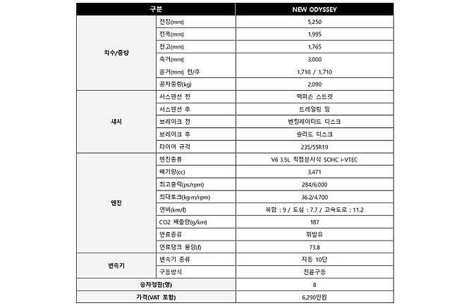 뉴 오딧세이는 3.5리터 V6 SOHC i-VTEC 가솔린엔진과 10단 자동변속기를 통해 최고출력 284마력(6000rpm), 최대토크 36.2kgm(4700rpm)다. 공차중량 2090kg, 복합연비 9.0km/ℓ(도심 7.7, 고속 11.2)다. 저부하 주행시 3기통만 사용하는 VCM(Variable Cylinder Management)을 지원한다.