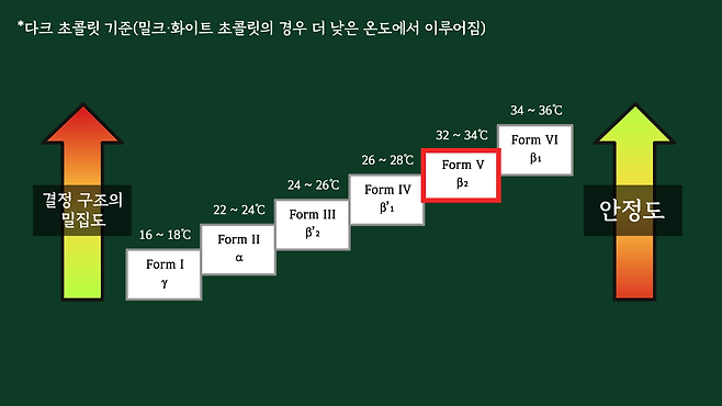템퍼링 과정은 각기 다른 성질의 지방으로 매우 불안정하게 구성된 코코아버터의 결정 구조 상태를 안정적으로 만들어주는 작업입니다. 코코아버터의 지방은 온도에 따라 다른 형태로 결정화될 수 있는데, 가장 안정적인 형태는 Form V(β 2)입니다.