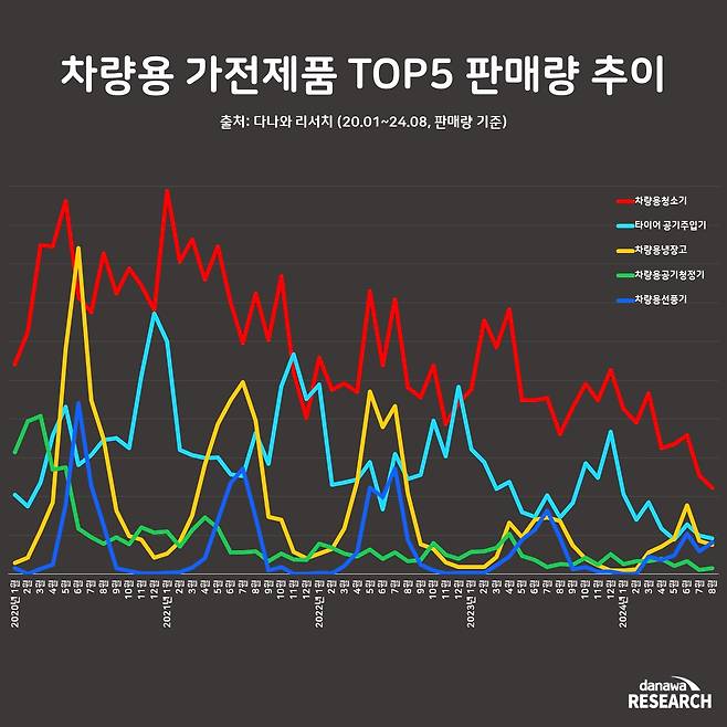 반면, 타이어 공기주입기(노란색), 차량용 냉장고(파란색), 차량용 선풍기(하늘색)는 여름철에 판매량이 급등하는 계절 가전으로서의 특성을 보여주었으며, 차량용 공기청정기(녹색)는 공기질에 대한 관심이 높았던 2020년 판매량이 가장 높았고 에어컨이 공기 청정 기능을 한다는 정보가 알려지면서 판매량이 감소했다. 전반적인 차량용 가전제품의 판매량은 점차 감소하고 있는 추세다.