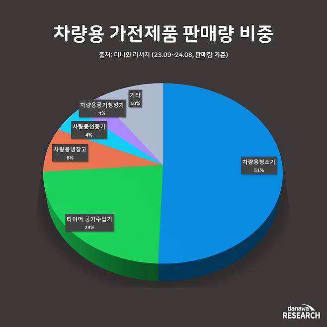 지난 1년간 차량용 가전제품 판매량을 분석한 결과, 세차 용품인 차량용 청소기가 51%의 비중으로 편의 용품이나 수리 용품보다 훨씬 높은 판매 비율을 기록했다. 그 뒤를 이어 수리 용품인 타이어 공기주입기가 23%, 편의 용품인 차량용 냉장고가 8%로 나타났다. 차량용 선풍기와 공기청정기는 각각 4%의 비율을 차지해, 세차 용품에 대한 관심이 주행 안전 관련 제품보다 높다는 것을 보여준다.