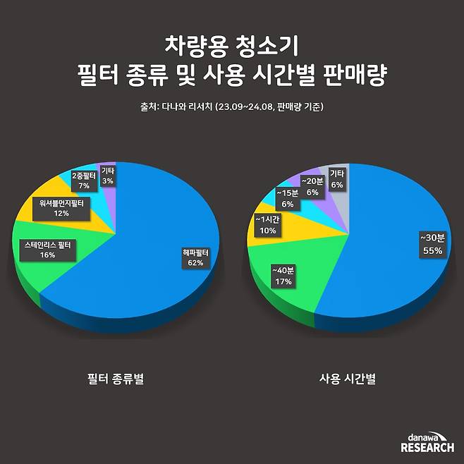 필터 종류별 판매량에서는 해파 필터가 62%로 가장 큰 비중을 차지했으며, 스테인리스 필터는 16%, 워셔블 먼지 필터는 12%로 나타났다. 해파 필터는 주로 공기청정기나 가정용 청소기에서 사용되며, 등급별로 미세먼지 필터링이 가능하지만 차량용 청소기의 해파 필터 등급은 확인이 어렵다. 스테인리스 필터는 세척 후 재사용이 가능한 반영구적 필터로, 유지비 절감에 유리하며, 워셔블 먼지 필터는 헤파 필터와 유사한 섬유형 필터로, 물 세척 후 재사용이 가능해 실용적이다.