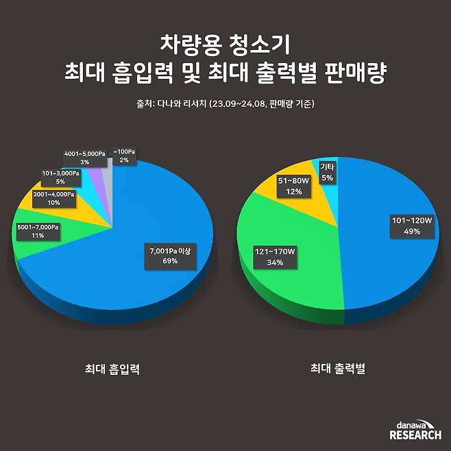차량용 청소기의 최대 흡입력과 출력별 판매량을 분석한 결과, 흡입력 옵션 중 가장 높은 등급인 7,001Pa 이상의 흡입력을 가진 제품이 전체 판매량의 69%로 가장 인기가 높은 것으로 나타났다. 그 뒤를 이어 5,001~7,000Pa 제품이 11%, 3,001~4,000Pa 제품이 10%의 비율을 차지했다.