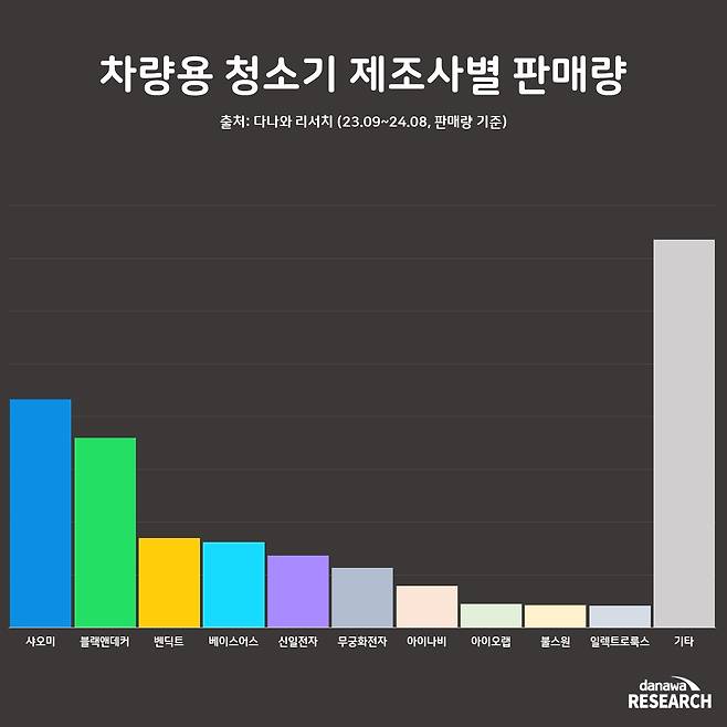 제조사별 판매량 데이터를 살펴보면 샤오미가 가장 높은 판매량을 기록했으며, 그 뒤를 이어 블랙앤데커가 뒤따르고 있다. 두 브랜드는 다른 제조사들보다 입지가 월등히 높은 것을 확인할 수 있다. 그 뒤를 이어서 벤딕트, 베이스어스, 신일전자가 중위권 그룹을 이뤄 뒤를 따르고 있다. 이 외에도 무궁화전자, 아이나비, 아이오랩, 불스원 일렉트로룩스가 선전 중이다.
