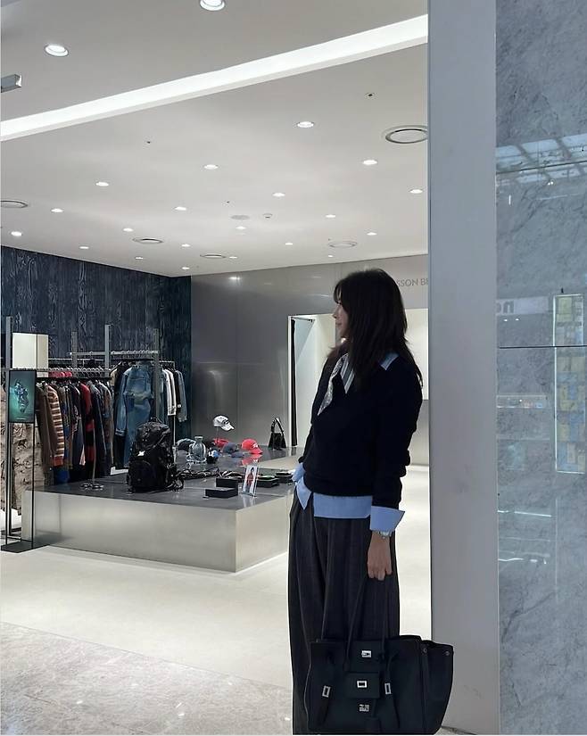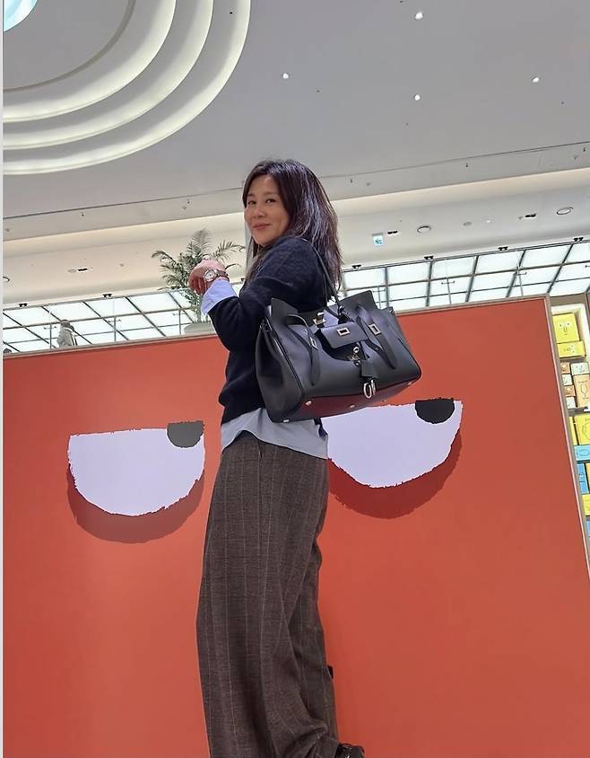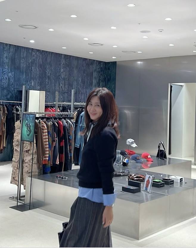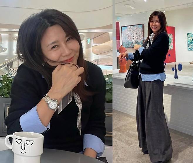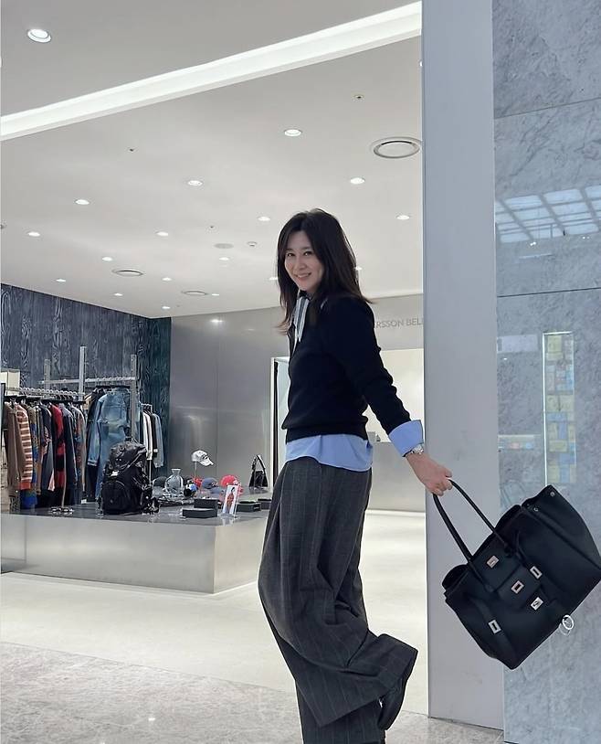 양정아는 하늘색 셔츠 위에 블랙 니트를 레이어드해 스타일리시하고 세련된 패션을 선보였습니다.