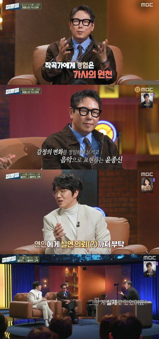 이날 손석희는 작사, 작곡을 하는 윤종신에 “소설가도 자기 이야기를 쓰면 잘 쓰는데 윤종신 씨는 가사가 경험에서 나온 거냐”라고 물었다.