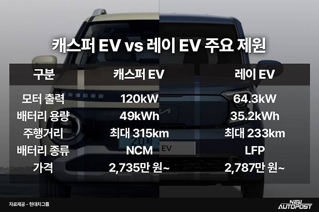 하지만 배터리 화학 성분과 충전 안정성 면에서는 의견이 갈린다. 레이 EV는 LFP(리튬인산철) 배터리를 사용해 내구성과 안전성에서 강점을 보이며, 캐스퍼는 NCM(니켈·코발트·망간) 배터리로 보다 높은 에너지 밀도를 바탕으로 주행거리를 확보했다.