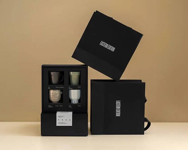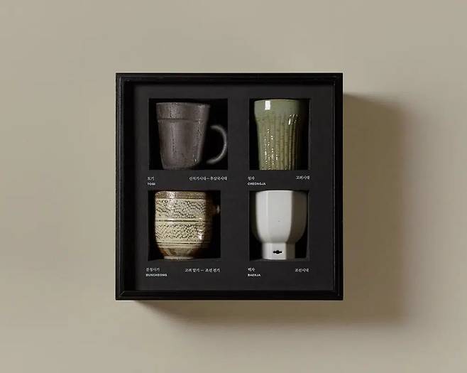 한국 전통에 대한 가치를 진중하고 또 귀중하게 다루는 브랜드 ‘이스턴에디션’의 컵 세트다. 후삼국시대의 토기부터 고려시대 청자, 고려말 조선 전기의 분청사기, 조선시대의 백자까지 오랜 시간을 품은 시대별 도자기를 한 상자에 담았다. 상자를 여는 순간부터는 전시를 감상하는 듯한 기분이 들기도 한다.