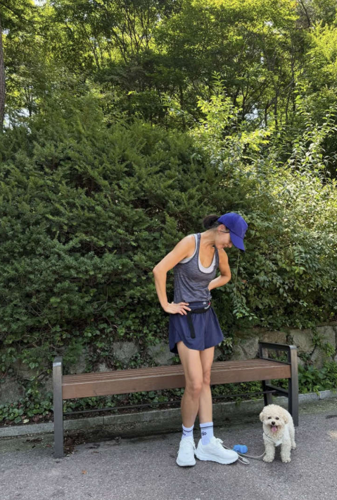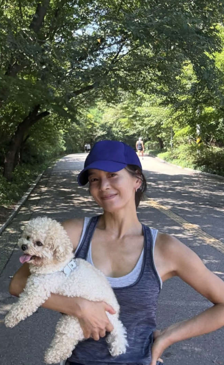 푸른 숲길 사이로 햇살이 스며드는 오전, 그녀의 민낯은 오히려 더 맑게 빛났다. 반려견을 품에 안은 환한 웃음은 보는 이들의 발걸음을 멈추게 했다.