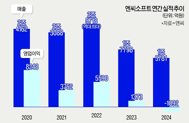 엔씨는 신작이 내놓는 족족 기대에 미치지 못하며 지난해 1092억원의 영업손실을 냈다. 상장 후 처음이고, 1998년 설립 후 26년 만이다.