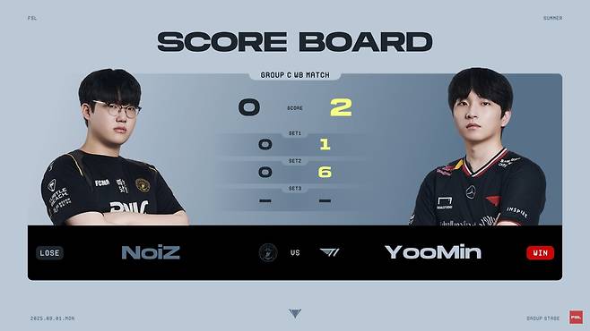 2025년 9월 1일, 잠실 DN 콜로세움에서 열린 '2025 FSL SUMMER' 32강 승자조 경기에서 T1의 '유민' 김유민 선수가 BNK 피어엑스의 '노이즈' 노영진 선수를 세트 스코어 2:0으로 제압하고 16강 진출에 성공했다.