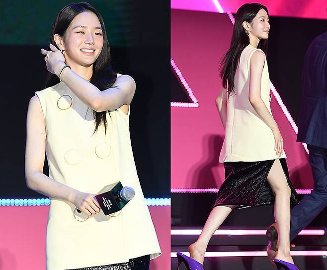 눈길을 사로잡은 건 단연 치마의 사이드 슬릿으로, 튜닉의 기장을 적절히 활용해 긴 다리 라인을 부각했고, 다소 과감한 옆 트임이 걸을 때마다 자연스럽게 드러나며 우아한 관능미를 더했습니다.