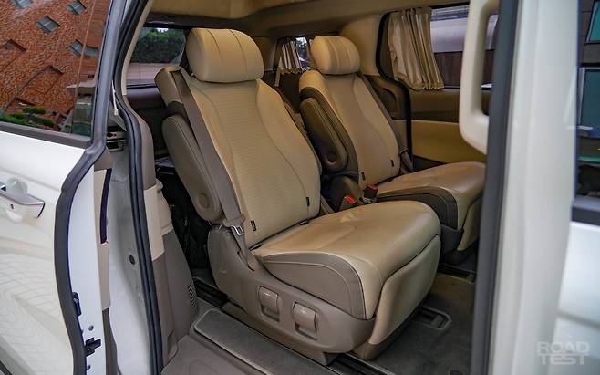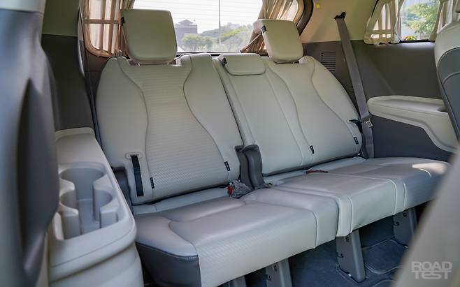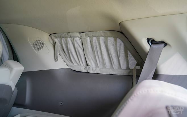 2열 옵션도 호화롭다. 시트 통풍과 열선, 빌트인 공기청정기, 21.5인치 스마트 모니터가 기본이다. 창문을 완전히 뒤덮는 커튼은 롤러식 선 블라인드보다 빛 차단 능력이 뛰어나 잠들기 좋다. 지붕 테두리에는 LED 독서등을 숨겼고, 컵홀더에는 냉/온장 기능을 챙겼다. 휴게소에서 산 아이스커피 얼음을 부산까지 지켜낼 만큼 성능도 확실하다.