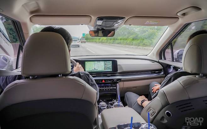 서울 강남의 신논현역 로드테스트 사무실에서 부산 벡스코까지의 거리는 정확히 395㎞. 4시간 넘는 긴 여정을 2열에서 시작했다. 먼저 다가온 장점은 시트 착좌감이다. 쿠션이 적당히 푹신하고, 허벅지와 옆구리를 안락하게 감싸 안는다. 더불어 ‘프리미엄 릴렉션 시트’는 몸을 눕히고 다리까지 받친다. 이후 윙 타입 헤드레스트에 머리를 기대니 잠이 솔솔 온다. 뒷좌석 승객을 위한 배려가 가득하다.