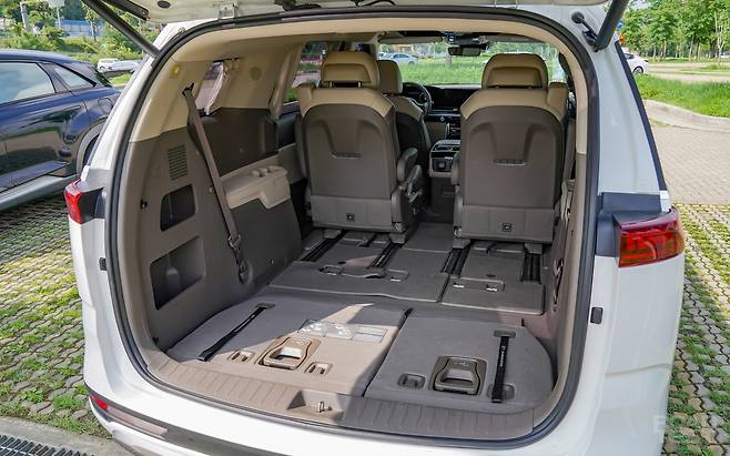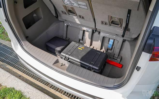시승차는 7인승으로, 2+2+3 구조의 1·2·3열 시트를 갖췄다. 우리 인원은 총 여섯. 캐리어와 촬영 장비까지 모두 품기는 어려웠다. 어쩔 수 없이 두 명을 다른 차로 밀어내고, 3열 시트를 접은 뒤 모든 짐을 욱여넣었다. 바닥에 완전히 가라앉는 ‘싱킹(Sinking)’ 기능 덕분에 깔끔하게 짐 정리를 마치고 출발했다.
