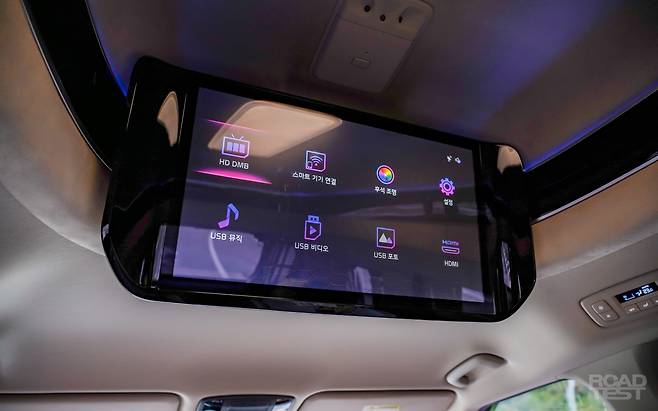 그러나 첫 번째 단점도 넘쳐나는 옵션 속에 있다. 머리 위 21.5인치 모니터의 활용성이 의문이다. 스마트폰을 연동하지 않고 쓸 수 있는 기능은 HD DMB. 채널은 많은데, 대부분 수신 상태가 고르지 않다. 게다가 화질도 영 별로라 오래 보고 싶지 않다. 스마트폰 화면을 공유하는 ‘미러링’ 기능은 안드로이드 OS 기기만 지원한다. USB를 꽂아 음악과 영상을 재생하는 방법도 있는데, 매번 파일을 옮겨 담는 수고를 굳이 해야 할까?
