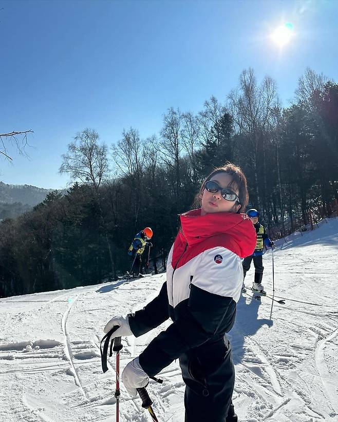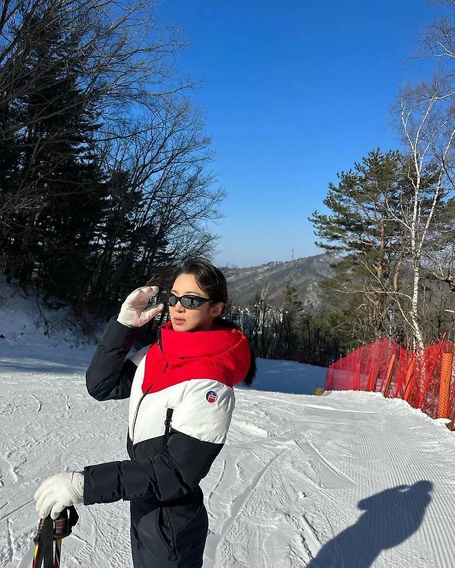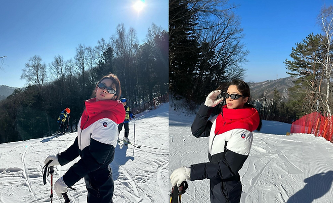 사진 속 효연은 빨간색과 흰색, 검은색이 믹스된 스키 점퍼와 블랙 팬츠를 입고 스키를 즐기는 모습을 선보였다.