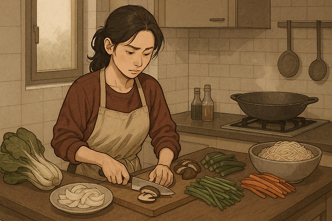국수 한 그릇을 만드는 과정이 얼마나 복잡한지 모르는 사람들이 있다. 육수를 내고, 면을 삶고, 고명을 준비하고, 그릇을 데우고, 양념을 맞추는 일련의 과정들이 '간단하게'라는 단어 하나로 축소된다. 잡채는 더하다. 각종 채소를 따로 볶고, 당면을 불리고 삶고, 양념을 만들고, 모든 재료를 섞어 간을 맞추는 과정이 최소 한 시간은 필요한데도 '간단하게 비벼먹자'는 표현으로 뭉뚱그려진다. 이런 발언은 요리하는 사람의 수고를 인지하지 못하고, 매 끼니가 저절로 차려진다고 생각하는 무의식적 태도를 드러낸다.