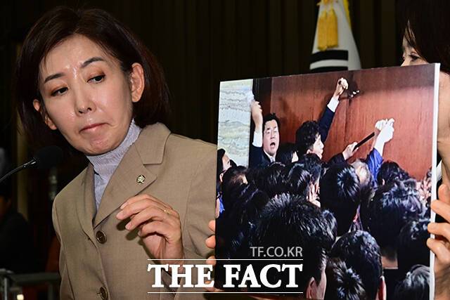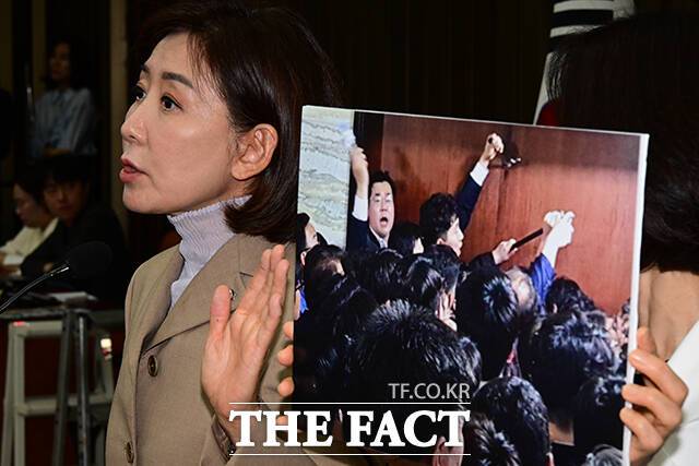 사진은 패스트트랙 충돌 사건 당시 '빠루(쇠지렛대)' 사진을 바라보는 나 의원의 모습.