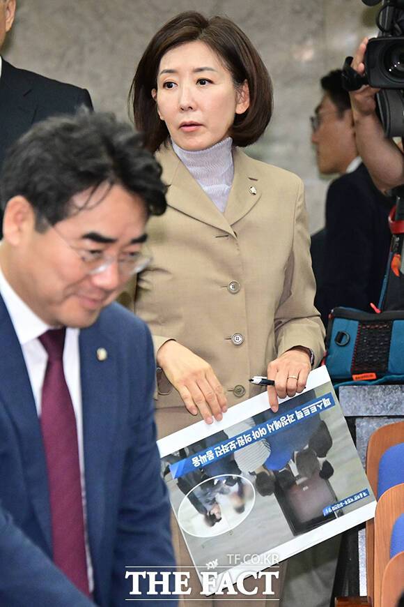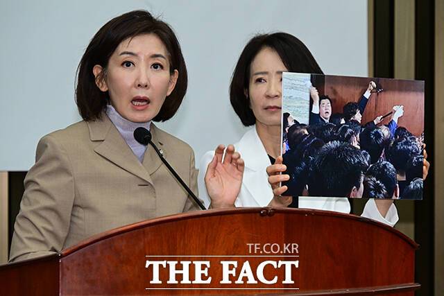 나 의원은 빠루가 찍힌 사진을 가리키며 "박찬대 의원이 이 빠루로 문을 뜯는 경호원과 민주당 관계자를 지휘하는 사건"이라며 "이렇게 폭력적으로 의회를 폭력 국회로 이들이 만들어 놓고 그다음 한 것이 프레임 씌우기"라고 주장했다.