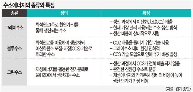 수소에너지는 생산 방식에 따라 그레이수소, 블루수소, 그린수소로 구분된다. 그레이수소는 주로 천연가스 같은 화석연료를 이용해 생산되며, 이 과정에서 상당량의 이산화탄소가 배출된다. 블루수소는 동일한 방식으로 생산되지만, 이산화탄소를 포집·저장(CCS) 기술로 처리해 배출량을 줄인다. 그린수소는 태양광·풍력 등 재생에너지를 활용해 물을 전기분해해 얻어진다. 물에 전류를 흘려 전기분해로 수소와 산소를 분리하는 과정에서는 이산화탄소 배출이 없기 때문에 가장 친환경적인 수소로 평가받는다.