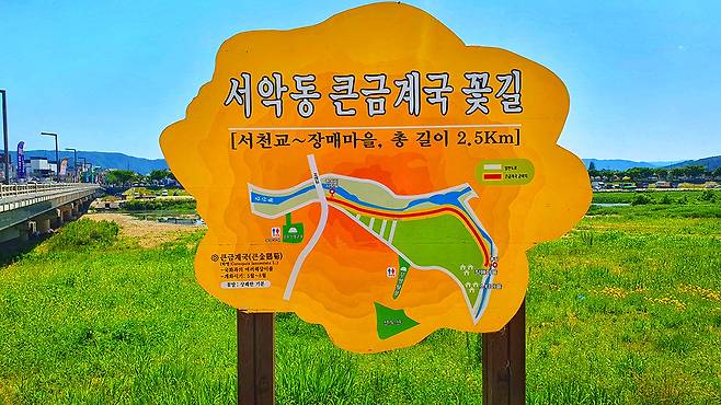 약 2.5km에 이르는 서천교에서 장매마을까지의 둑방길은 관광지 특유의 북적임이 없다. 대신 고요하고 넉넉한 분위기 속에서 꽃길을 따라 걷거나 자전거를 타기에 안성맞춤이다.