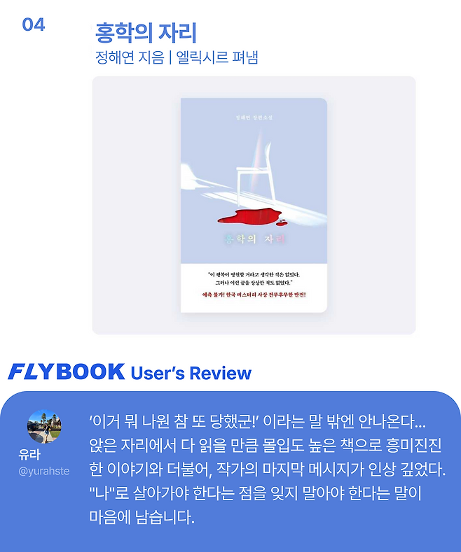 다들 흥미진진하게 읽을 수 있으니 국내 스릴러/추리 소설 읽고 싶으신 분들께 추천드립니다.