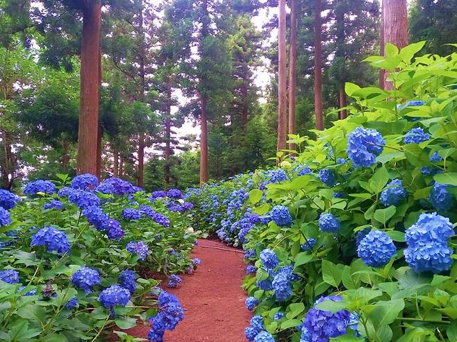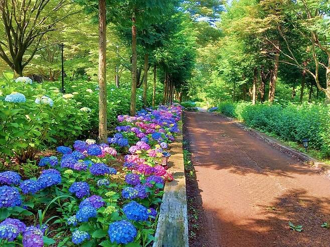 이 길을 따라 천천히 걷다 보면 시야에 수국들이 번져 나오고, 그 뒤편으로 피톤치드 가득한 편백나무 숲이 길을 에워싼다.