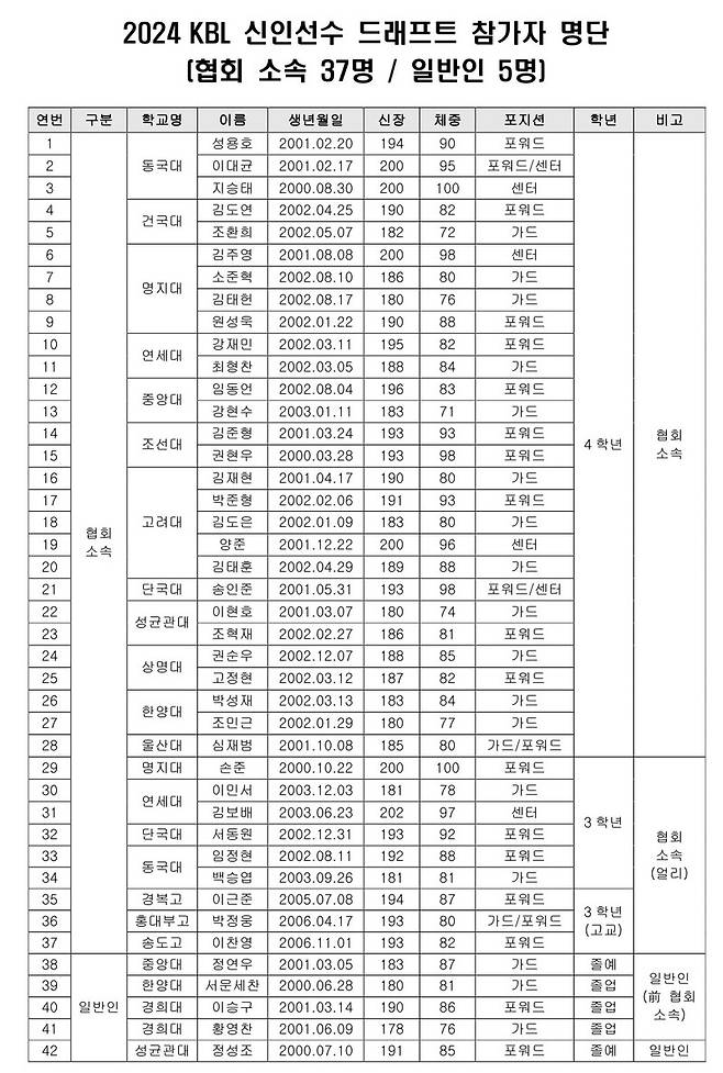 KBL은 ‘2024 KBL 신인선수 드래프트’에 참가하는 최종 42명 명단을 발표했다.