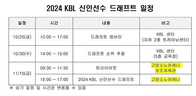 한편, 11월 15일(금) 개최하는 드래프트 행사는 고양소노아레나로 장소를 변경해 진행한다. 트라이아웃은 오전 9시 30분부터 고양소노아레나 보조체육관에서 진행하며, 선수 지명 행사는 오후 3시, 고양소노아레나에서 열릴 예정이다.