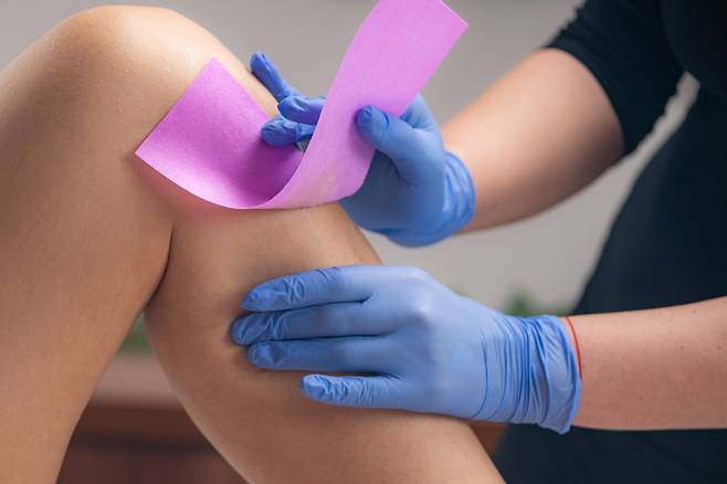 체모가 너무 길다면 왁스 도포 전 가위로 정리해야 하는데요. 첫 도포는 털의 반대 방향으로, 그다음에는 털이 자라는 방향으로 바릅니다. 스파츌라를 최대한 피부에 밀착시켜서 도포해야 합니다.