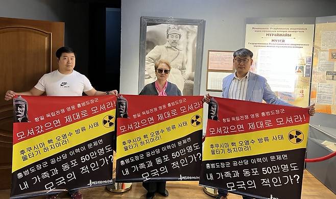 | ▲ "모셔갔으면 제대로 모셔라" 지난 1일 유보비 예술총감독이 홍범도장군이 수위로 일했던 카자흐스탄 고려극장 배우들과 함께 피켓을 들고 흉상 이전 계획 철회를 촉구하고 있다. |