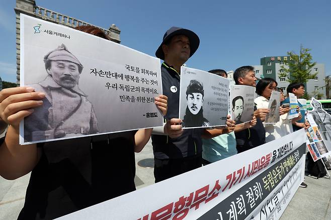 | ▲ 서울겨례하나, "홍범도 장군 흉상 철거 계획 철회!" 서울겨례하나 관계자들이 1일 오후 서울 독립문 앞에서 홍범도 장군 흉상 철거 계획 철회 등을 촉구하는 기자회견을 하고 있다. |