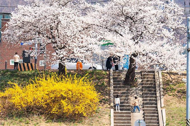 청주 시내 중심을 가로지르는 무심천은 도심 속에서도 자연을 만끽할 수 있는 공간이다. 봄이 되면 양쪽 제방을 따라 수천 그루의 벚나무가 흐드러지게 꽃을 피우며 산책로를 장관으로 만든다.