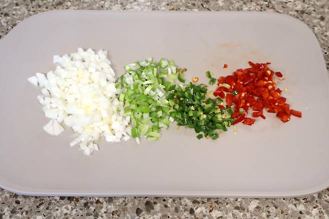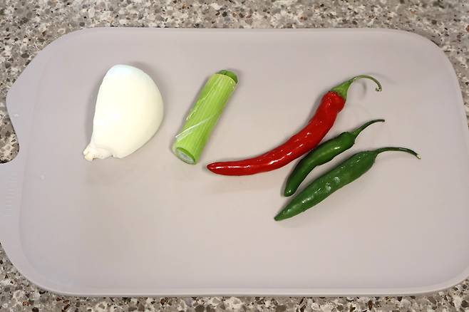 양파 1/4개, 홍고추 1개, 청양고추 2개, 대파는 손가락 길이 정도로 준비했어요. 깨끗하게 씻어준 다음~!