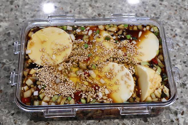 참기름 1큰술과 통깨를 뿌립니다. 뚜껑닫고 냉장고에 넣어서 6시간 정도 지난 뒤부터 드시면 돼요.