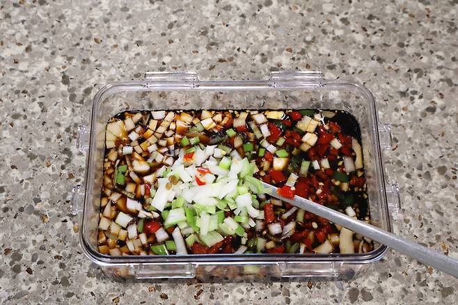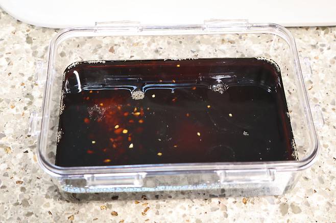 넓은 반찬통에 진간장 100ml, 물 100ml, 설탕 1큰술, 다진마늘 1큰술, 맛술 2큰술, 올리고당 2큰술 넣어요. 깊은 통 말고 넓고 얕은 통이 좋아요.