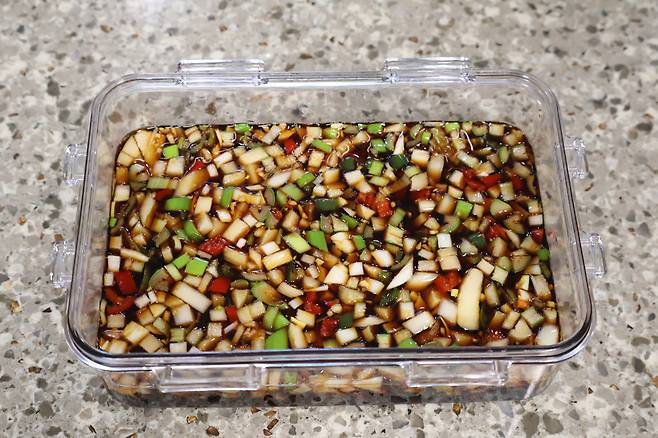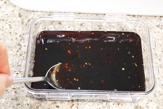 진간장 100ml, 물 100ml, 설탕 1큰술, 올리고당 2큰술, 맛술 2큰술, 다진마늘 1큰술, 참기름 1큰술, 통깨