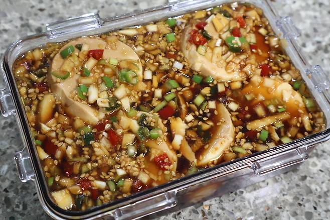 만들어 둔 양념에 퐁당퐁당 넣어요.