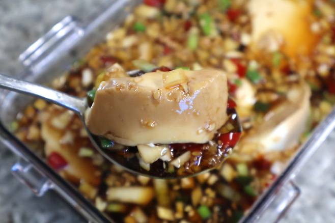 6시간 지나면 이렇게 순두부에 양념이 잘 베어들어요. 양념 그대로 듬뿍 떠서 밥 위에 비벼 먹으면 꿀맛!