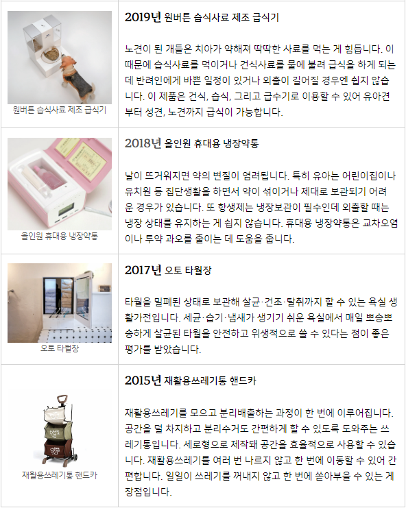 이 자리에서 주기적으로 먹는 약을 꺼낸 후 뚜껑을 닫고 버튼을 누르면 복용 여부를 표시해주는 황은영 씨의 ‘약 보관함’은 국회의장상을 받았습니다. 안소윤 씨는 냄비 밖으로 손실되는 열을 도넛 형태의 주전자에 전달해 에너지를 절약하는 ‘캠핑용 도넛 주전자’를 개발해 국무총리상을 수상했습니다. 그밖에 ▲자동식 물 공급으로 손쉽게 화분을 관리하는 ‘싱글화분’ ▲콘택트렌즈 착용 가능 기간을 확인할 수 있는 ‘렌즈 세척기’ ▲통집(원룸) 등 좁은 공간에 거주하는 1인가구를 위한 ‘수직수평 접이식 다리미판’ 등 최근 소비 경향에 맞는 발명 아이디어가 우수한 평가를 받았습니다.