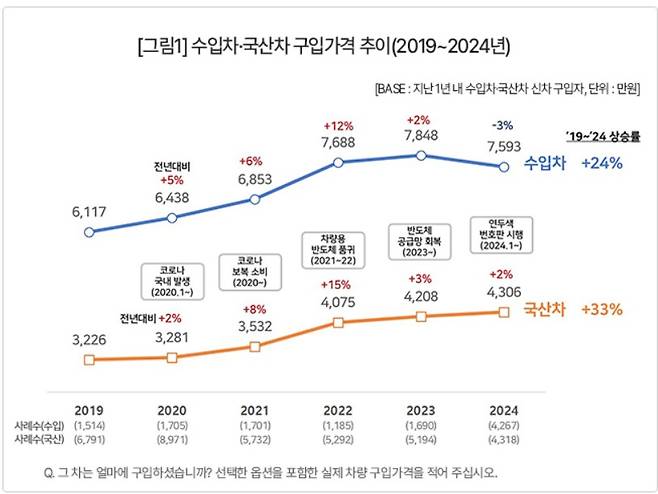 ○ 국산차 구입가격 추이도 ’24년을 제외하면 대체로 비슷했다. ’20년 +2%로 수입차보다 낮았으나 ’21년, ’22년에는 각각 8%, 15% 급등해 수입차 상승률을 앞섰다. 수입차가 3% 하락한 ’24년에도 상승세(+2%)를 이어갔다.