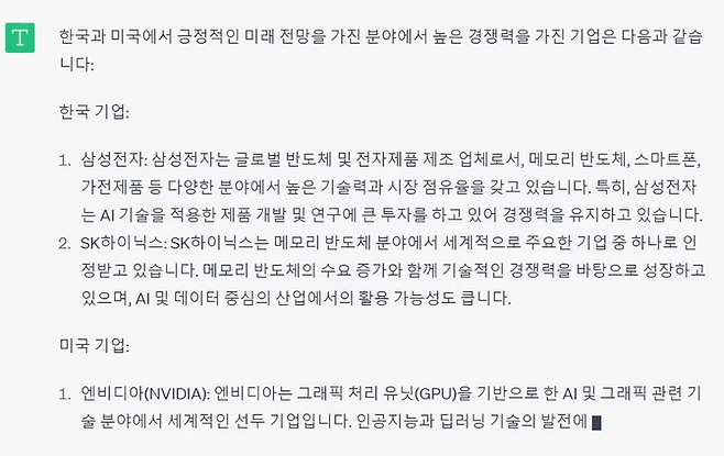 이는 기존의 전통적인 감정 분석 측면에서 시도되던 트레이딩 전략과 어느 정도 유사성을 가지고 있기에, 투자 결정에 대한 참고 자료로도 활용 가치가 있다고 보여지는 것이죠. Chat GPT로 주가의 동향을 예측하는 것은 위험한 일이지만, 기업 분석과 전망과 관련된 콘텐츠를 얻을 수 있다는 사실도 이같은 의견에 힘을 실어줍니다. 우리가 직접 분석하려고 하는 기업의 정보를 입력하고, 그에 기반한 학습을 지시하면 유의미한 정보를 취득할 수 있기 때문이죠.