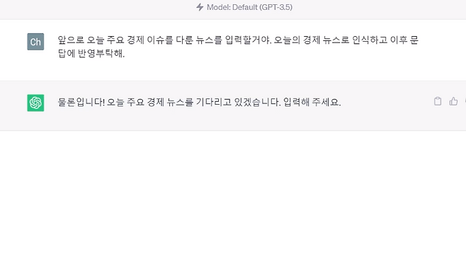 가령, Chat GPT의 첫 질문에 '앞으로 오늘 주요 경제 이슈를 다룬 뉴스를 입력할거야. 오늘의 경제 뉴스로 인식하고 이후 문답에 반영 부탁해'라고 입력하는 것입니다. 이후, 뉴스 콘텐츠를 입력하고 여러분이 원하는 질문을 던지면 그에 기반한 대답을 Chat GPT가 해주는 것입니다.